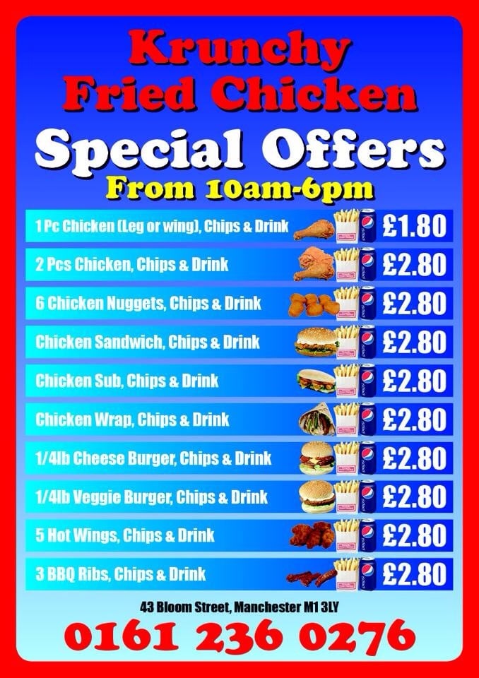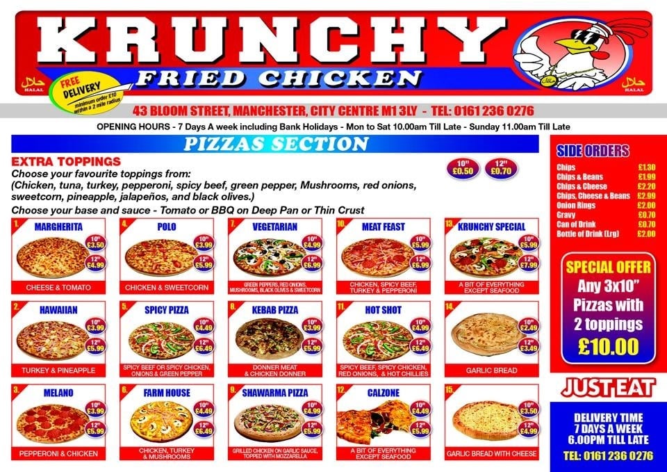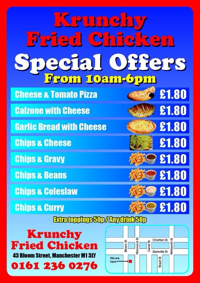 Introducing Krunchy Fried Chicken, a gem nestled in Manchester's vibrant gay village. This establishment specializes in more than just chicken; it offers a delightful array of pizza, fast food options, and savory chicken wings. Known for its fresh, made-to-order meals, Krunchy Fried Chicken ensures every dish is packed with flavor.